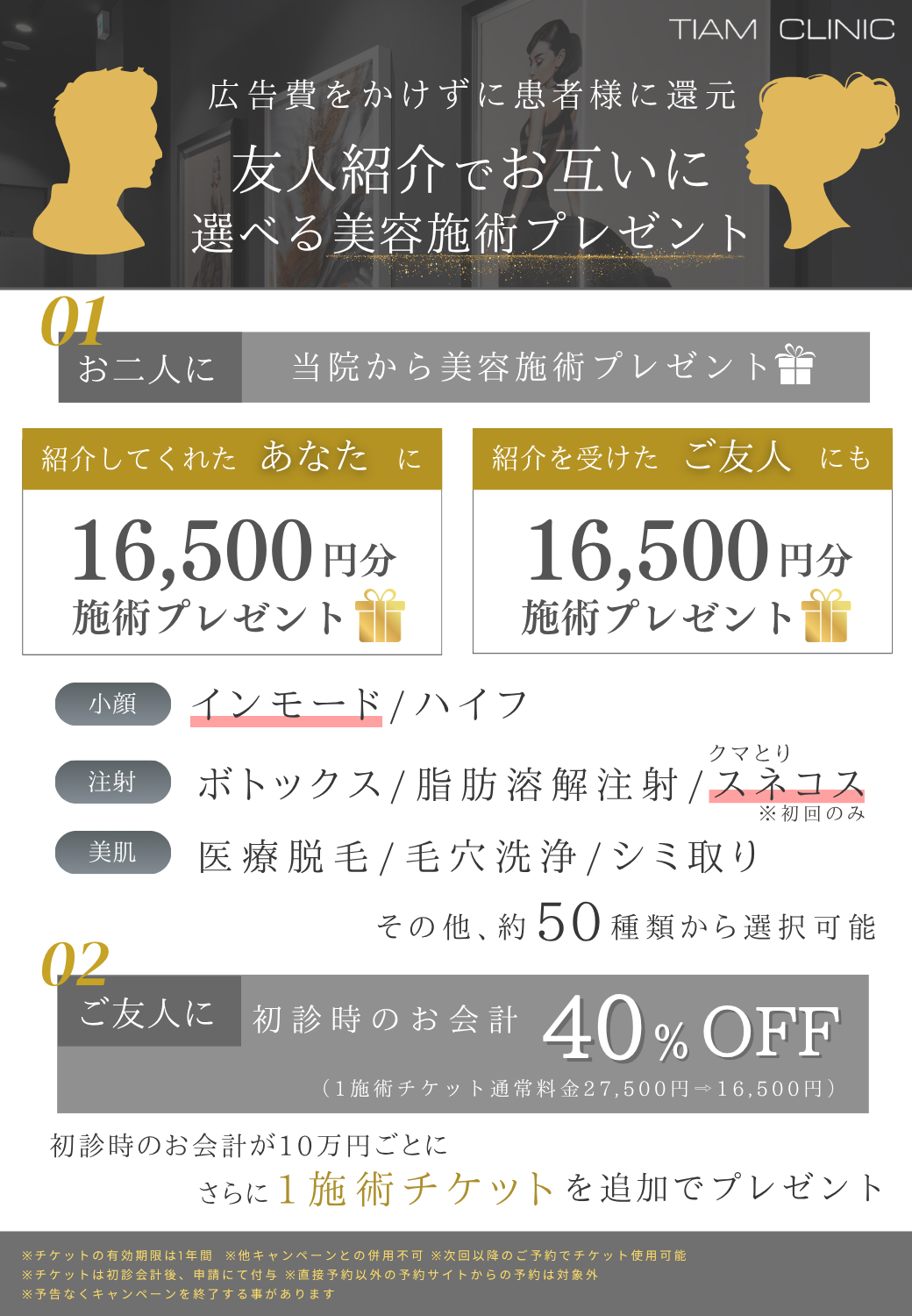 ご友人が料金に関わらず施術を受けるだけで | 1チケット (通常27,500円相当)還元 |